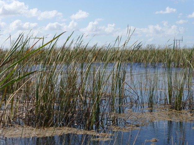 In reality, the Florida Everglades are green and wheat-colored grass-like stalks growing out of the water, so thick in patches that you can barely even see the water on a boat ride through it. This stretches on for miles and miles.