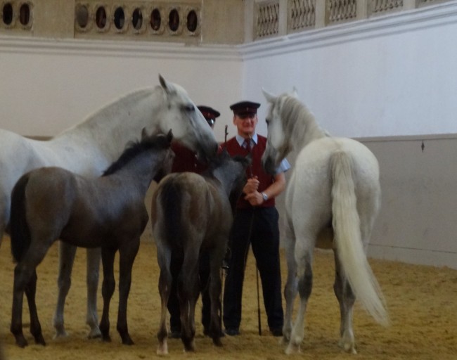 Lipizzaner foals learn very early to lift their feet (a big part of classical horsemanship) and they are groomed daily so that they immediately feel comfortable with humans.