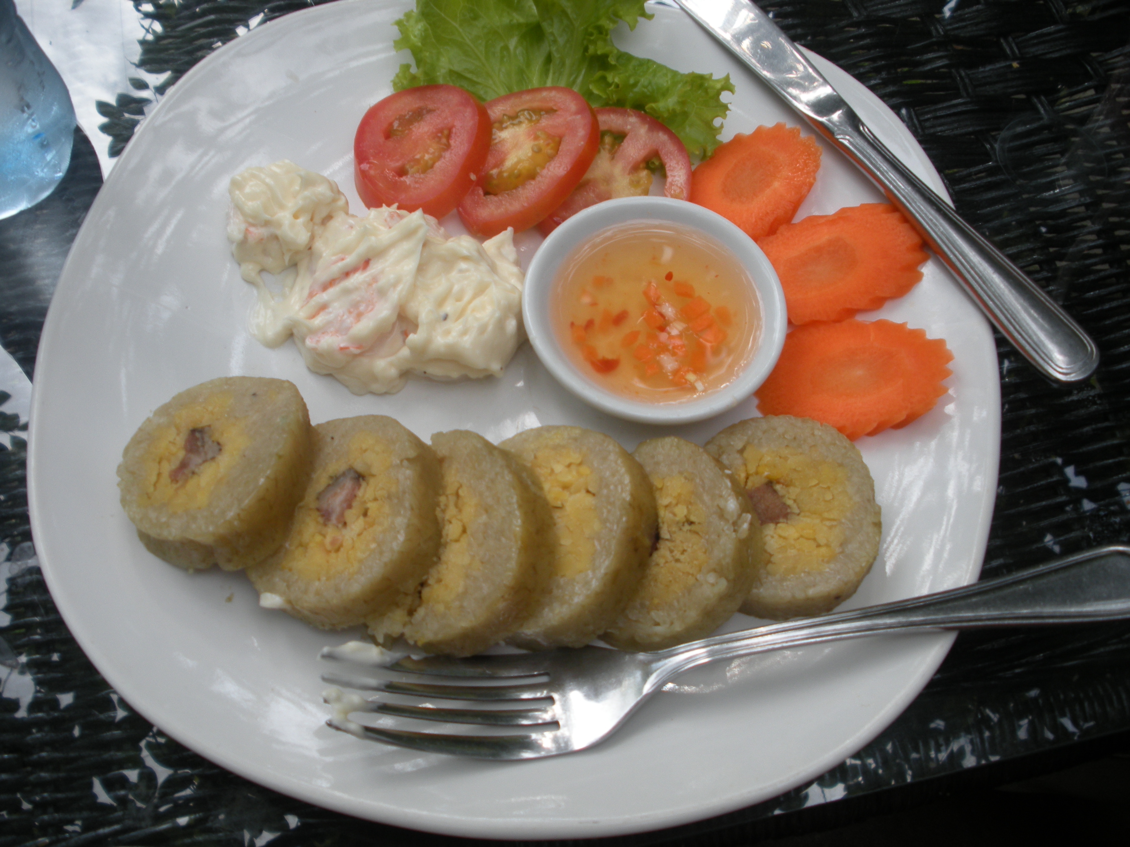 Anyway, I was busy eating my main dish, a bean with pork wrapped cornmeal roll…thing. (Like I said: weird. Ok, ok, it’s probably not that weird in Cambodia. I’ll say different.)